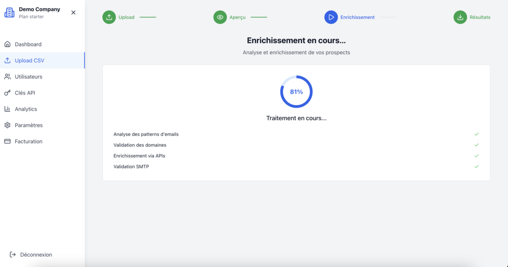 enrich.py(CLI), FastAPI (app.py) pour mode API - Connecteurs : Sirene/Pappers, DNS/MX, heuristique pattern email, hooks pour Hunter/Dropcontact